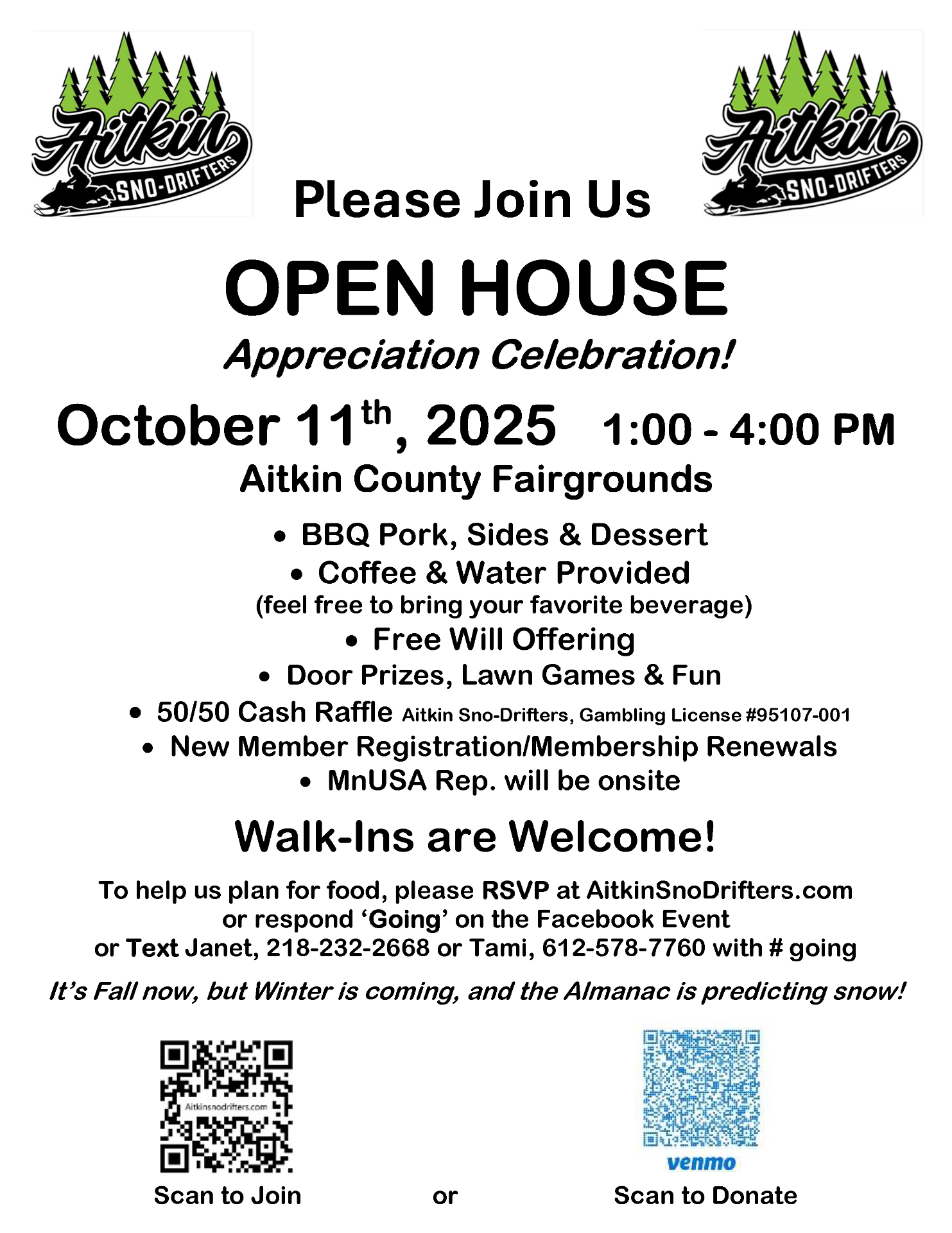 The Aitkin Sno-Drifters is a non-profit, volunteer run snowmobile club established in 1974. It is located in western Aitkin County, approximately 20 miles north of Lake Mille Lacs. The club maintains one PistenBully & two Bombardier groomers and roughly 85 miles of trails, in and around the city of Aitkin MN. The club holds it's monthly meetings on the second Tuesday of the month, located at The Moose Lodge 22 4th St NE, Aitkin, MN